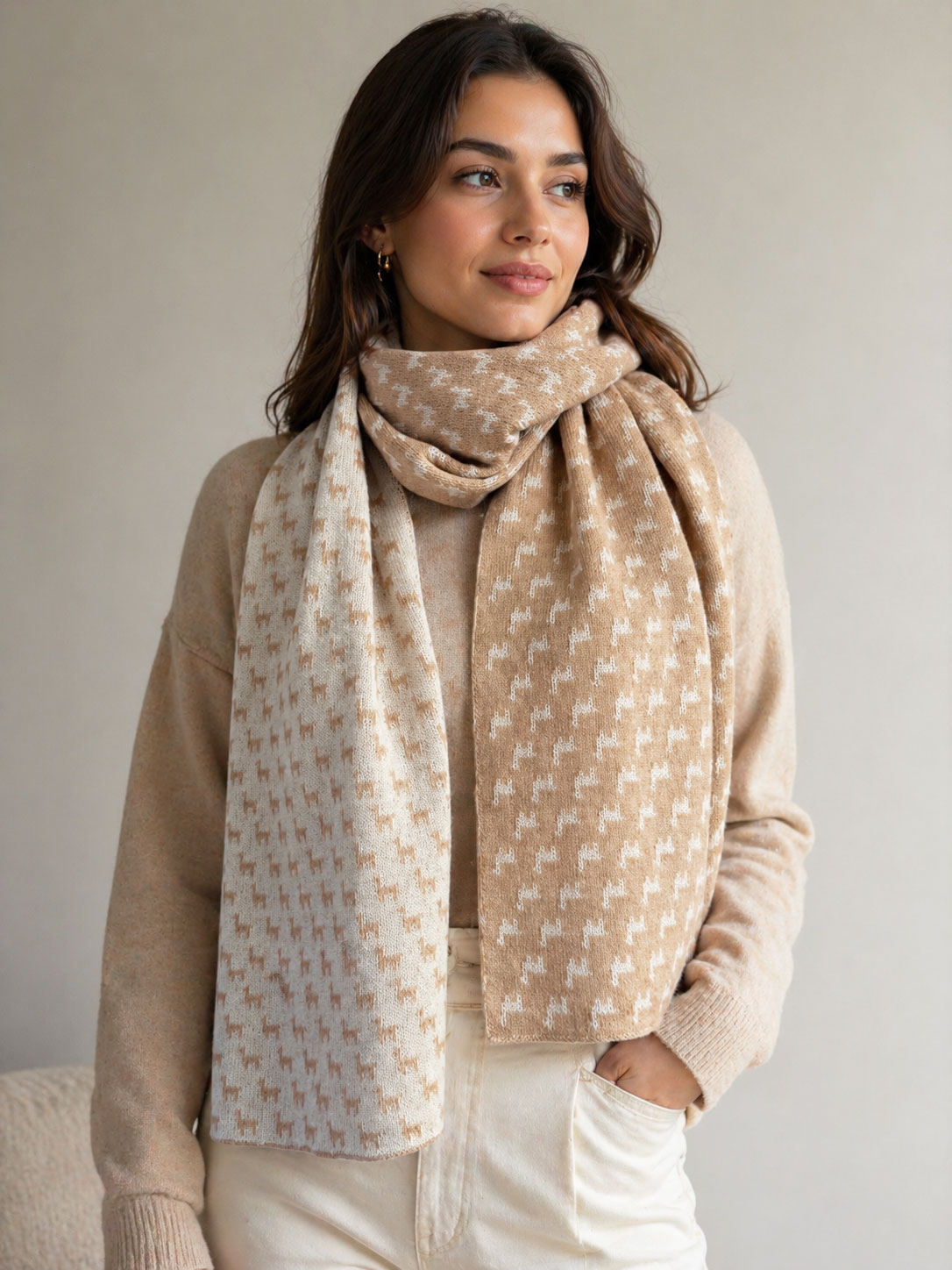Designed using a two-sided jacquard knit, this scarf features a reversible alpaca motif pattern—giving you two complementary looks in one. The refined design adds a subtle statement while staying timeless and easy to style.