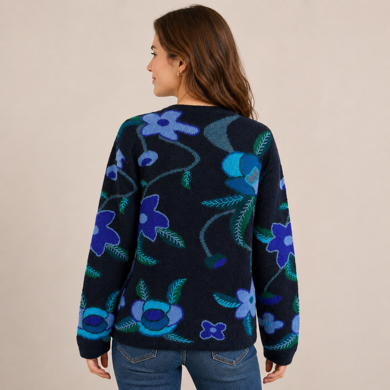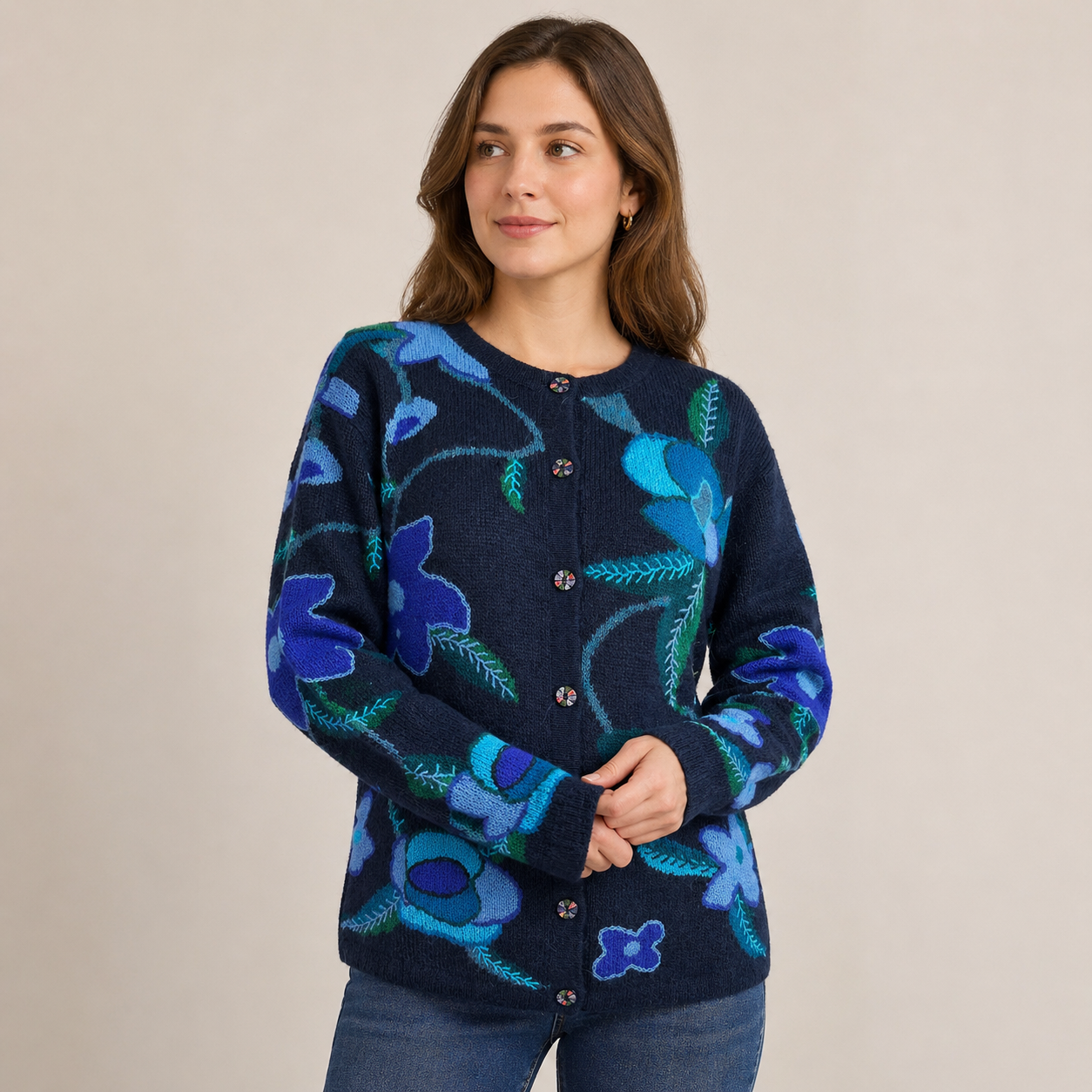 Rich, elegant, and effortlessly wearable, this alpaca cardigan features a striking floral design in layered shades of blue and teal set against a deep navy base. The tonal palette gives it a refined, modern feel while still showcasing the artistry of traditional craftsmanship.